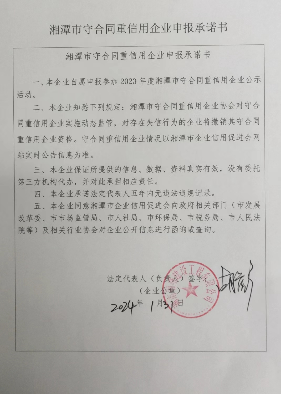 本企業(yè)根據(jù)《湘潭市守合同重信用企業(yè)申報規(guī)定》等編制 2023 年度企業(yè)信用報告書,并保證本報告書內(nèi)容真實、準(zhǔn)確、完整。
