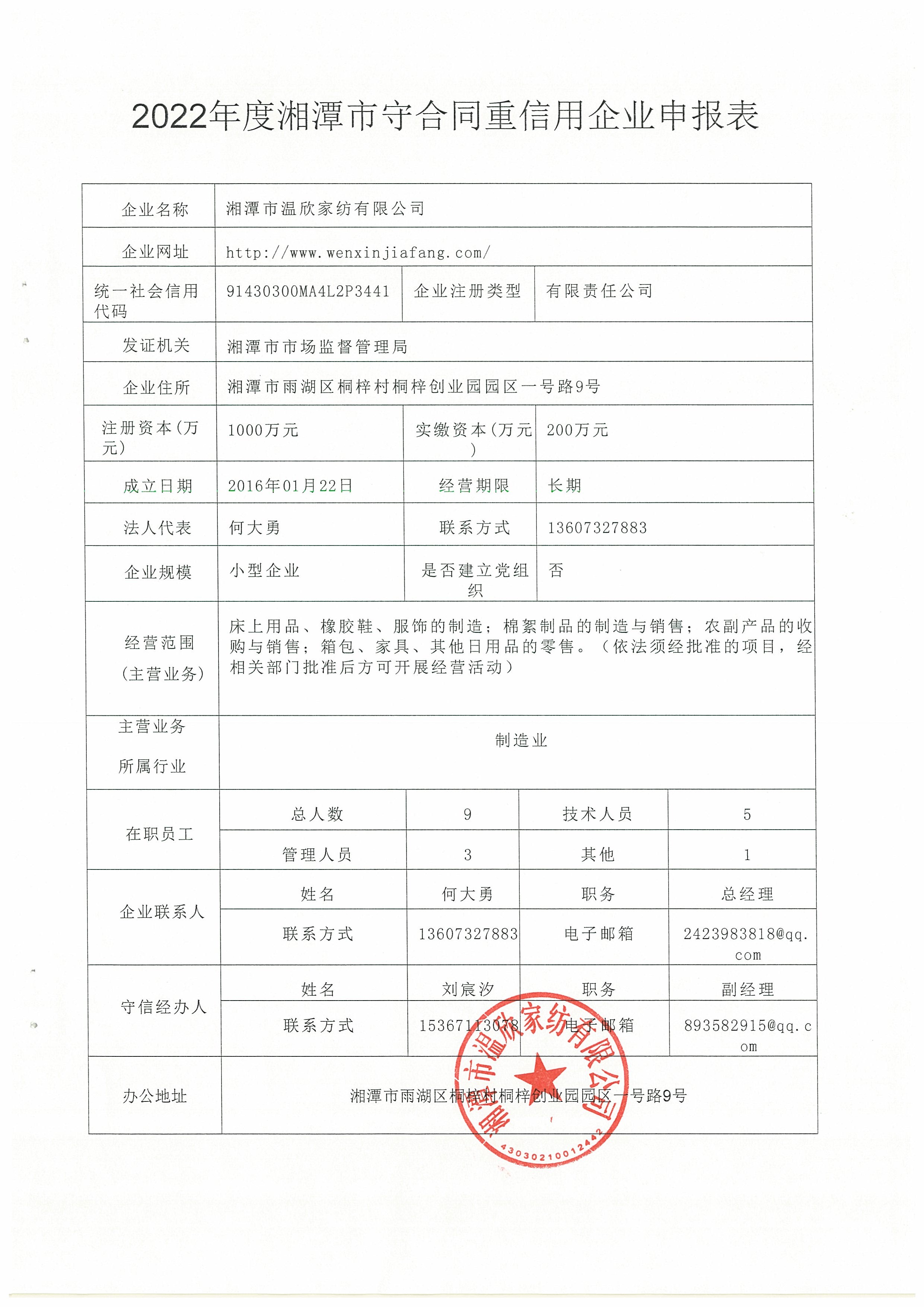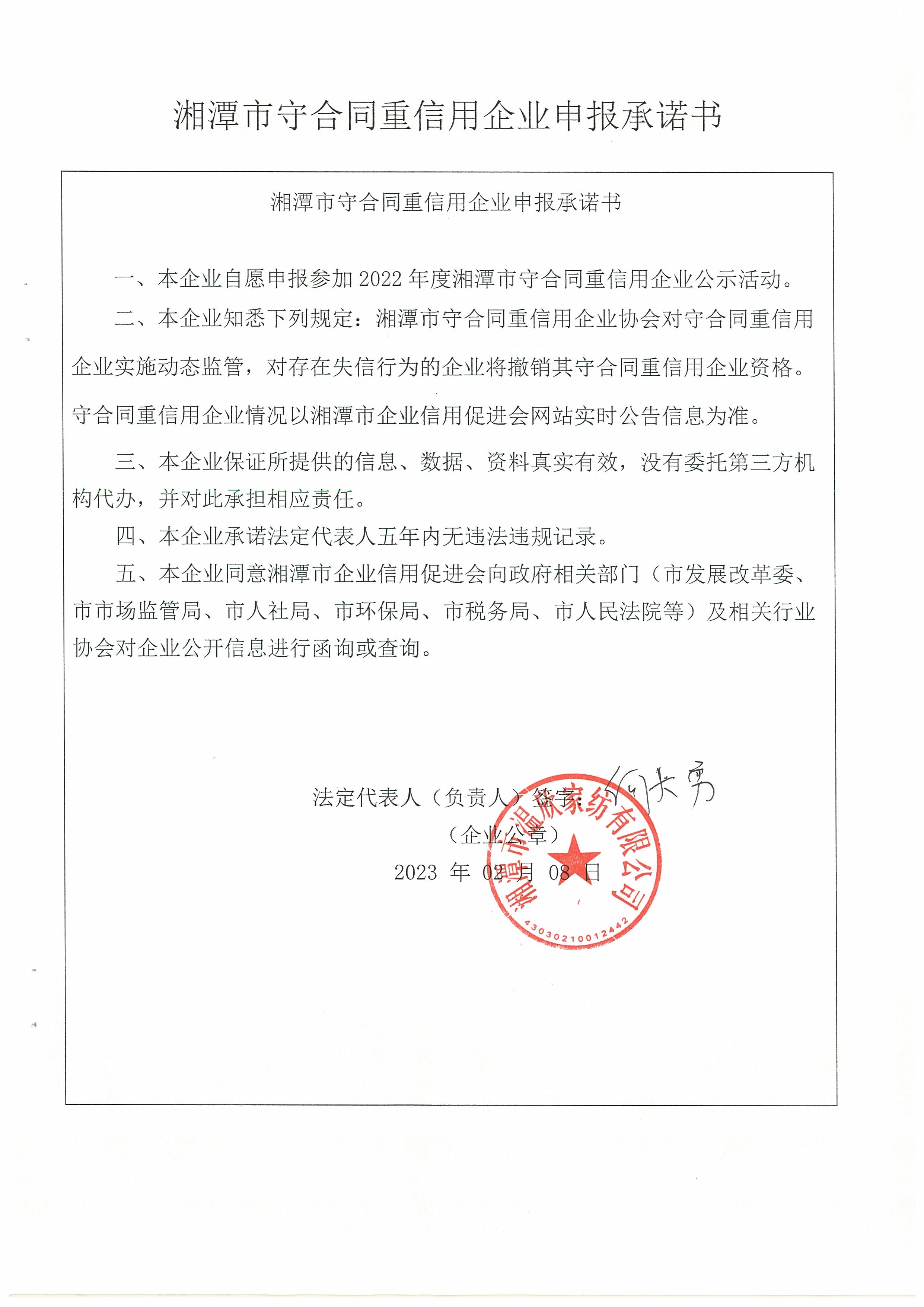 本企業(yè)根據(jù)《湘潭市守合同重信用企業(yè)申報規(guī)定》等編制 2022 年度企業(yè)信用報告書,并保證本報告書內(nèi)容真實(shí)、準(zhǔn)確、完整。